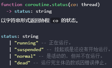 协同有三个状态:挂起态、运行态、停止态。当我们创建一个协同程序时他开始的状态为挂起态,也就是说我们创建协同程序的时候不会自动运行,可以使用 status 函数检查协同的状态: